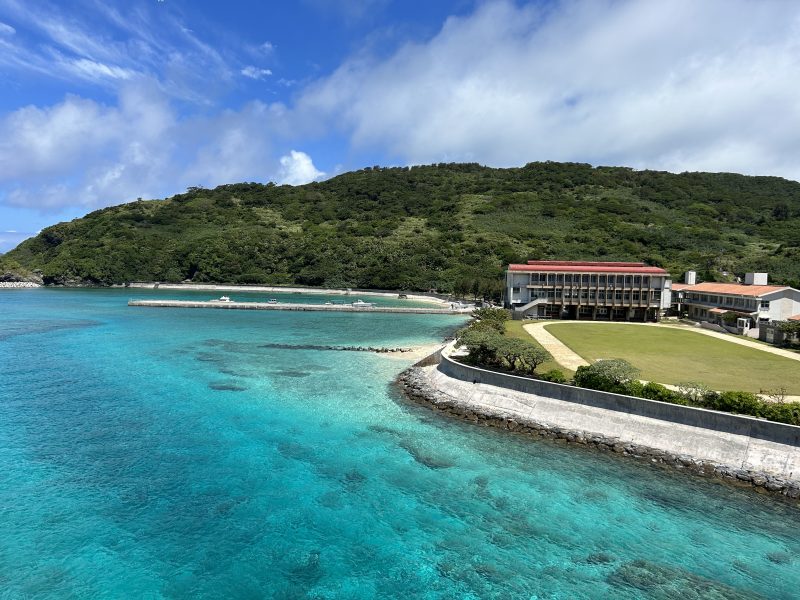 おすすめスポットは慶留間島と外地島をつなぐ慶留間橋の中間地点。海とグラウンドの緑と小学校の屋根の組み合わせが美しい。学校にはプールがなく、夏は海で泳ぐそう。小中学校に通う子供たちに聞いたのですが、小学生はスノーケリング、中学生はダイビングを授業でやるそうです。冬は教室の窓からクジラがジャバーンってやってるところまで見えちゃうそうですよ。